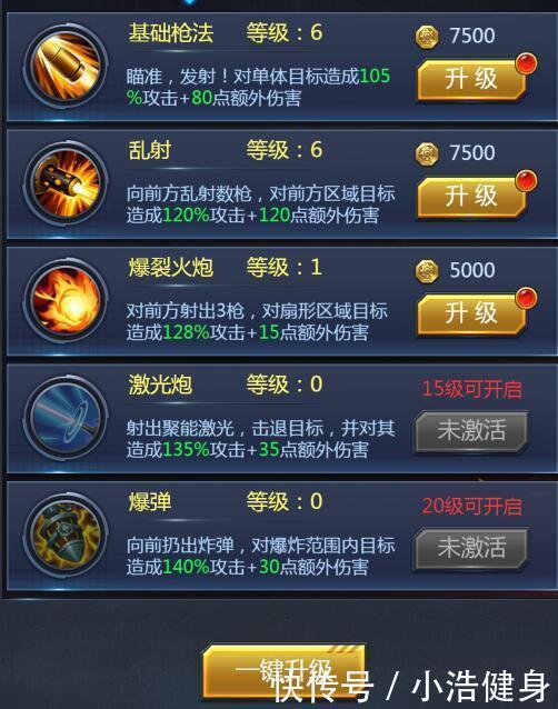 每个角色都有最初始的五个技能,玩家达到一定的等级后可以开启。使用金币可以增强技能等级与效果!