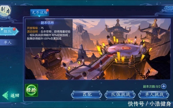 【介绍】:75级开启,在副本界面进入,击杀怪物可获得海量经验,等级越高经验越多,建议优先清完其他任务再做无限挑战,组队挑战更可获得30%经验加成。
