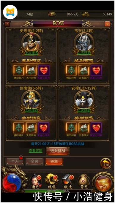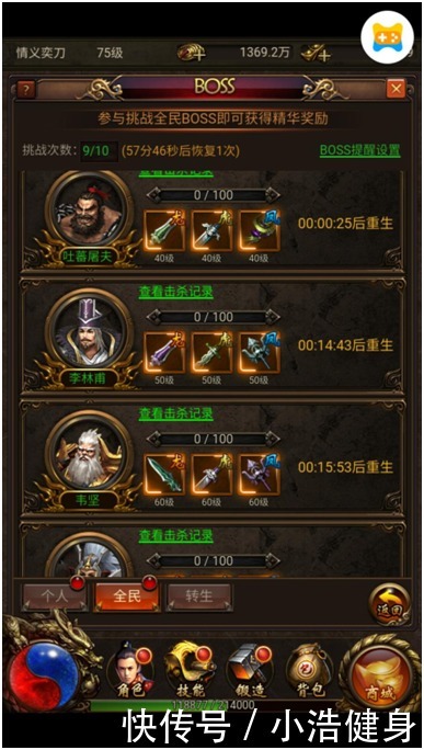 (Ps:全民、转生boss是按伤害排名给予奖励,各位将军除了要有强劲实力外,还要记得抢占先机哦。)
