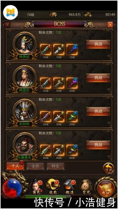 【介绍】: 达到一定等级即可开启相应的boss挑战权,有机会获得超强神装,每天刷新一次;