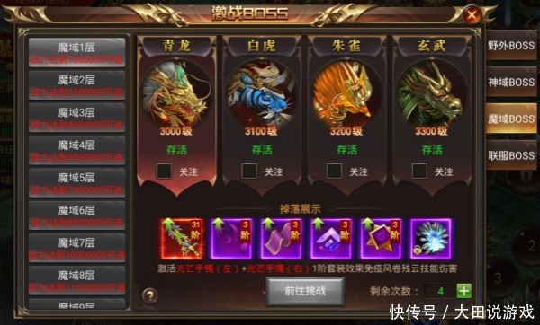 玩家在此处可以直观的了解到每一个魔域BOSS的名字、挑战要求,BOSS的等级,以及技能提示、掉落的道具、今天剩余的挑战次数,同时可以设置对哪些BOSS进行关注,被关注的BOSS刷新时,系统将会通知玩家。剩余次数不够用的话,玩家还可以额外的购买次数。