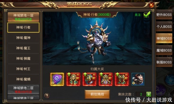 玩家在此处可以直观的了解到每一个神域BOSS的名字、进入等级,BOSS的等级,以及掉落的道具,以及今天剩余的挑战次数,同时可以设置对哪些BOSS进行关注,被关注的BOSS刷新时,系统将会通知玩家。剩余次数不够用的话,玩家还可以额外的购买次数。