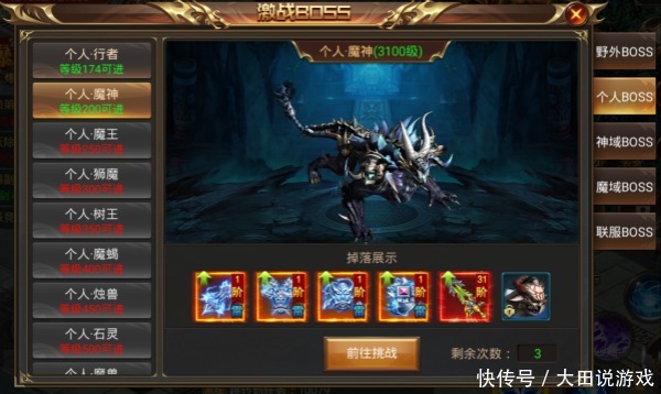 玩家在此处可以直观的了解到每一个个人BOSS的名字、进入等级,BOSS的等级,以及掉落的道具,以及今天剩余的挑战次数。